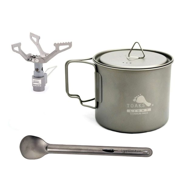 Tämä titaaninen keittiöpaketti sisältää 550 ml:n kattilan, pitkävartisen lusikan ja kaasukeittimen – kokonaispaino 117 g.